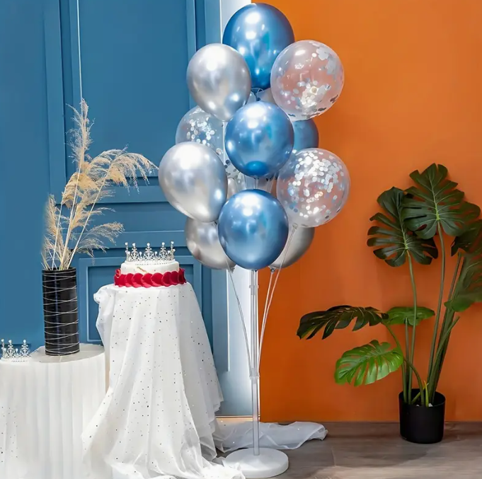 Mavi & Gümüş Balon Standı Seti Özel günlerinizi şık ve göz alıcı bir şekilde süslemek için ideal! Doğum günü, nişan, düğün, baby shower ve tüm kutlamalarda ortamınıza zarif bir hava katar. Kullanım Alanları: Doğum günü, nişan, baby shower, mezuniyet, açılış ve özel gün kutlamalarında şık dekor olarak kullanılabilir.